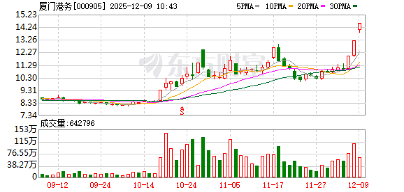 厦门港务盘中涨停,已连收3个涨停板,圭表9:31,该股报14.52元,换手率3.12%,成交量2315.29万股,成交金额3.29亿元,涨停板封单金额为3.03亿元。邻接涨停本事,该股累计飞腾33.09%,累计换手率为28.11%。最新A股总市值达107.71亿元,A股流畅市值107.71亿元。